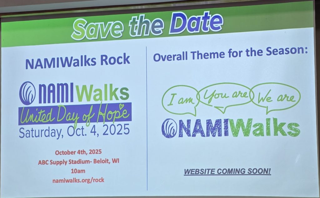 Luci Cramer introduced the day’s speaker, Lindsay Stevens. Lindsay is the director of the Janesville NAMI, the National Alliance on Mental Health. Originally started in the 1970s by two mothers whose sons had schizophrenia, the NAMI group has grown and now has a sizable office space. Previously named ‘AMI’ (friend, in French), the group is the largest grassroots mental health movement in the country.