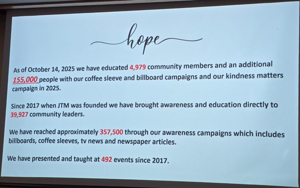 Kiwanis member John Sarnow asked, “How many people are affected worldwide?” Dawn replied, “The U. S. has 1.1M people currently being trafficked. That is approximately 3.3 people for every 1,000. There are 50 million people worldwide.”
