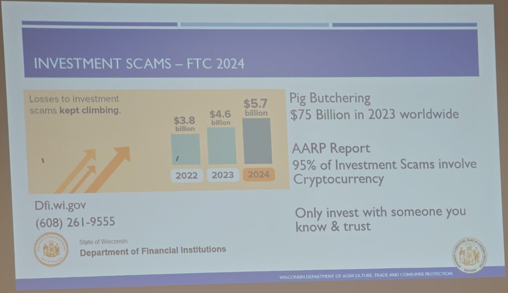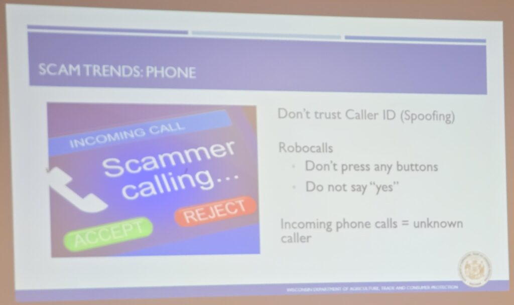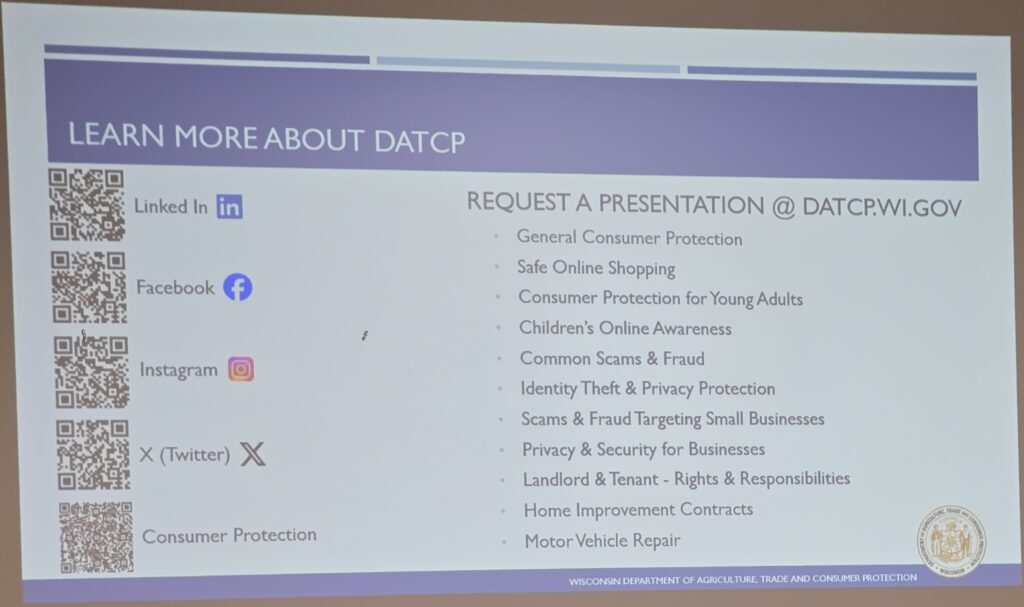Jenny Turco introduced the day’s speaker, Jeff Kersten. Jeff works at the Department of Agriculture, Trade and Consumer Protection for the State of Wisconsin. He was previously a police officer in fraud mitigation. Jeff now provides options for multiple presentations he can give about empowering the people of our great state to better themselves, such as the one he is doing today, Consumer Protection.